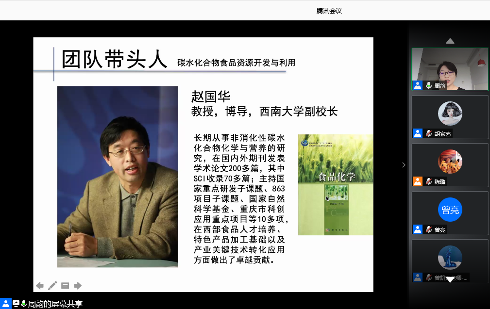 紧接着,周韵副教授、陈栋副教授、刘雄教授、陈应娟副教授、戴宏杰老师、曾凯芳教授、钟耕教授、明建教授依次就碳水化合物食品资源开发与利用、肉类科学与川菜工程技术、特色调味品资源开发与品质调控、茶与特色资源高效利用、食品蛋白质资源高值利用及食品安全监测与主动防控、食品贮藏与物流、西南地区特色植物多糖功能性食品创制、植物多酚营养与健康等研究团队及实验室资源等进行了全面详实的介绍,使同学们对博牛社区