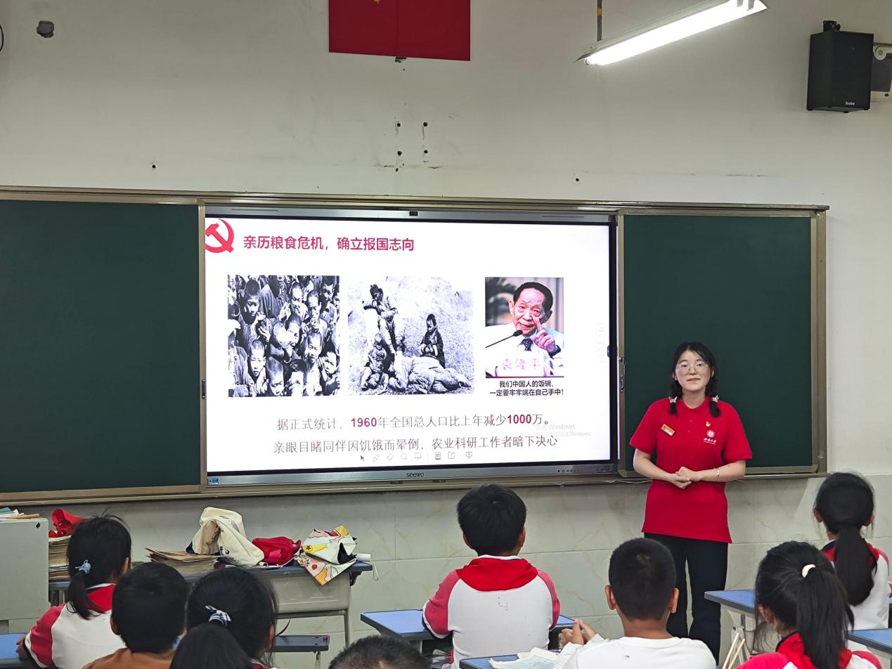 下午两点,西南大学党史学习教育研究生宣讲团郑丽源同志为四年级小朋友带来“可爱爷爷与神奇稻子”课程。从西南大学校友袁隆平院士的“禾下乘凉梦”到“杂交水稻覆盖全球梦”,回顾了袁隆平院士常思家国粟满仓的“为民谋稻粱” 之旅以及胸怀天下、矢志进取的科研历程,不仅展现了袁隆平院士涉猎广泛、多才多艺的一面,还在同学们心中塑造了一位可亲可敬、可感可学的“榜样爷爷”形象。郑丽源同志娓娓“道”来,在孩子心中播下梦想种子。