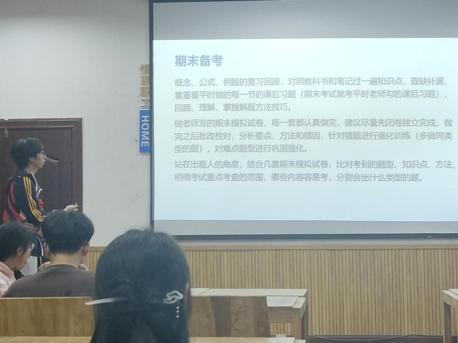 活动伊始,解雨果从高等数学出发,分别从课上和课下两个方面依次进行介绍,强调了同学们要上课听重点,下课及时查漏补缺,并以网上资源为辅,做好课后笔记,以便期末复习;对于线性代数,她向同学们强调了学会做笔记、记公式和及时复习巩固的重要性。