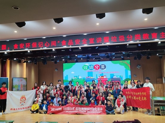 本科生第四党支部、火柴头失物招领中心承办的"寓教于乐进校园,食安环保记心间"食品安全知识宣讲和垃圾分类活动在西南大学附属小学“星光礼堂”顺利举办。