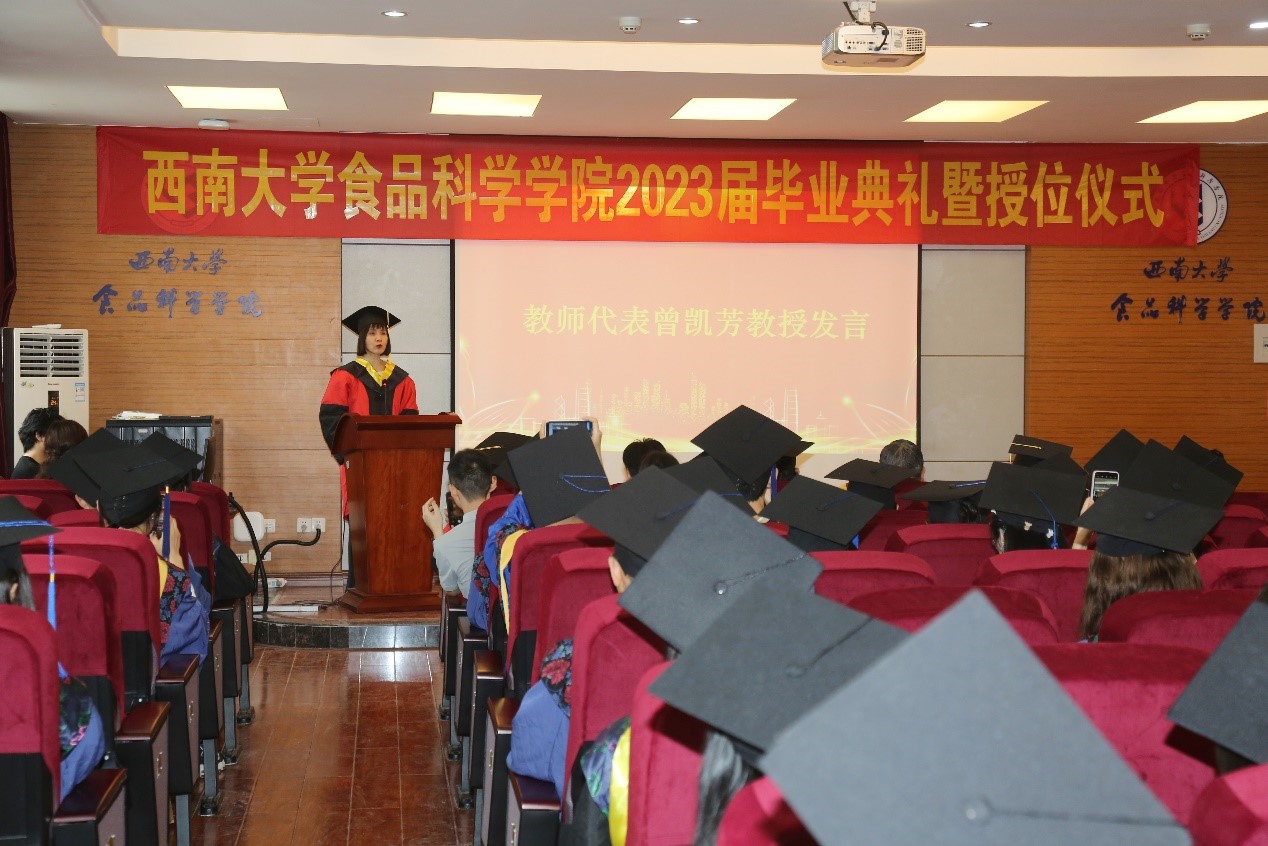 教师代表、博士生导师曾凯芳教授在发言中以自身为例、以果蔬保鲜专业知识为引,希望毕业生们能够强健体魄、锤炼意志、磨炼责任与担当,像生鲜果蔬需要尽量延长“保鲜期”一样,持续学习,保持青春的激昂与热血。