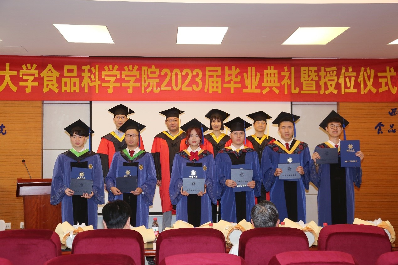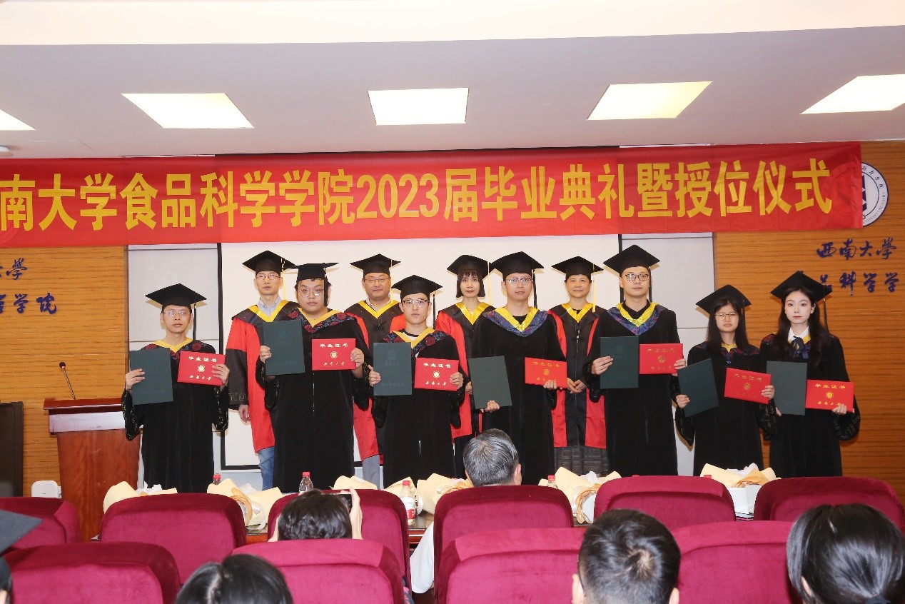在院长张宇昊宣读西南大学学位授予决定后。学术委员会代表依次为获得博士、硕士和学士学位的毕业生授予学位并拨穗。毕业生们双手接过证书,鞠躬致谢,并合影留念。
