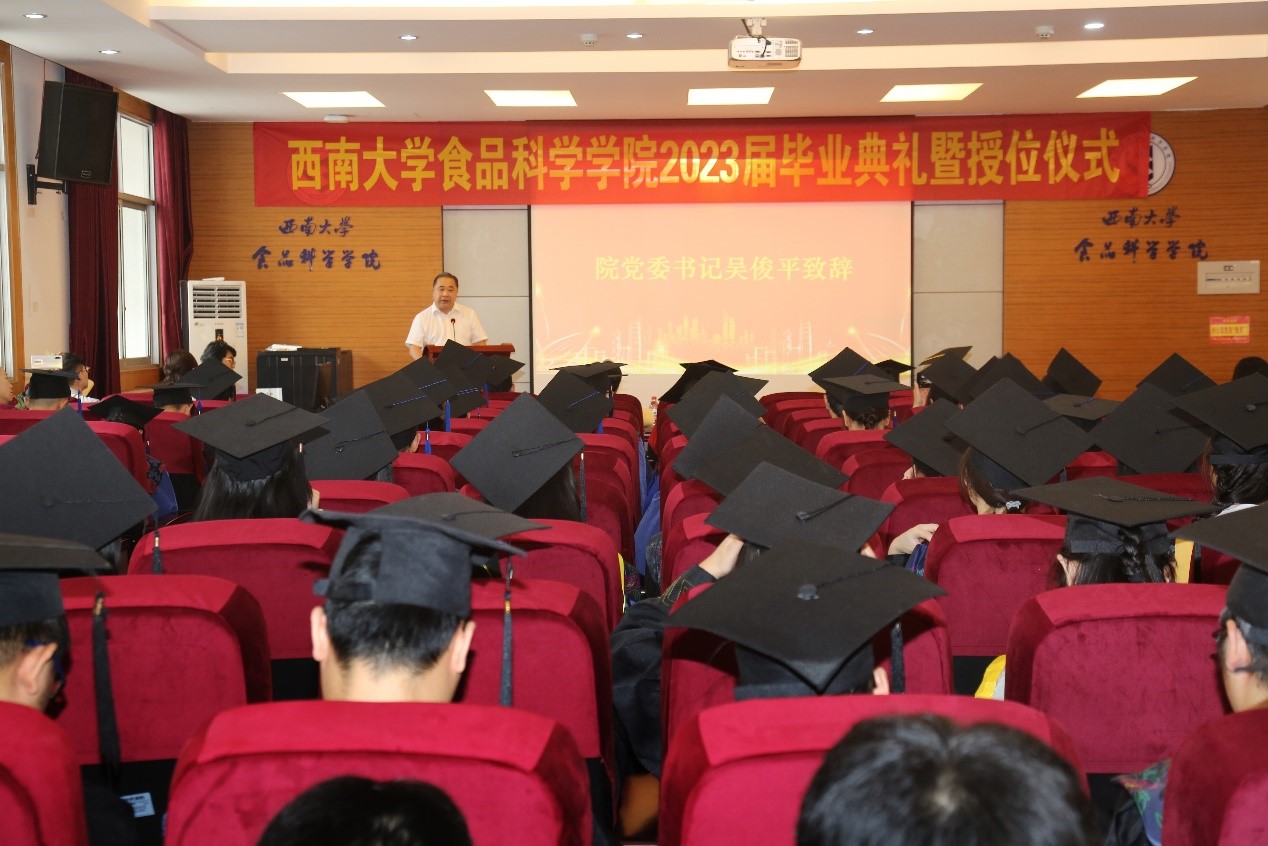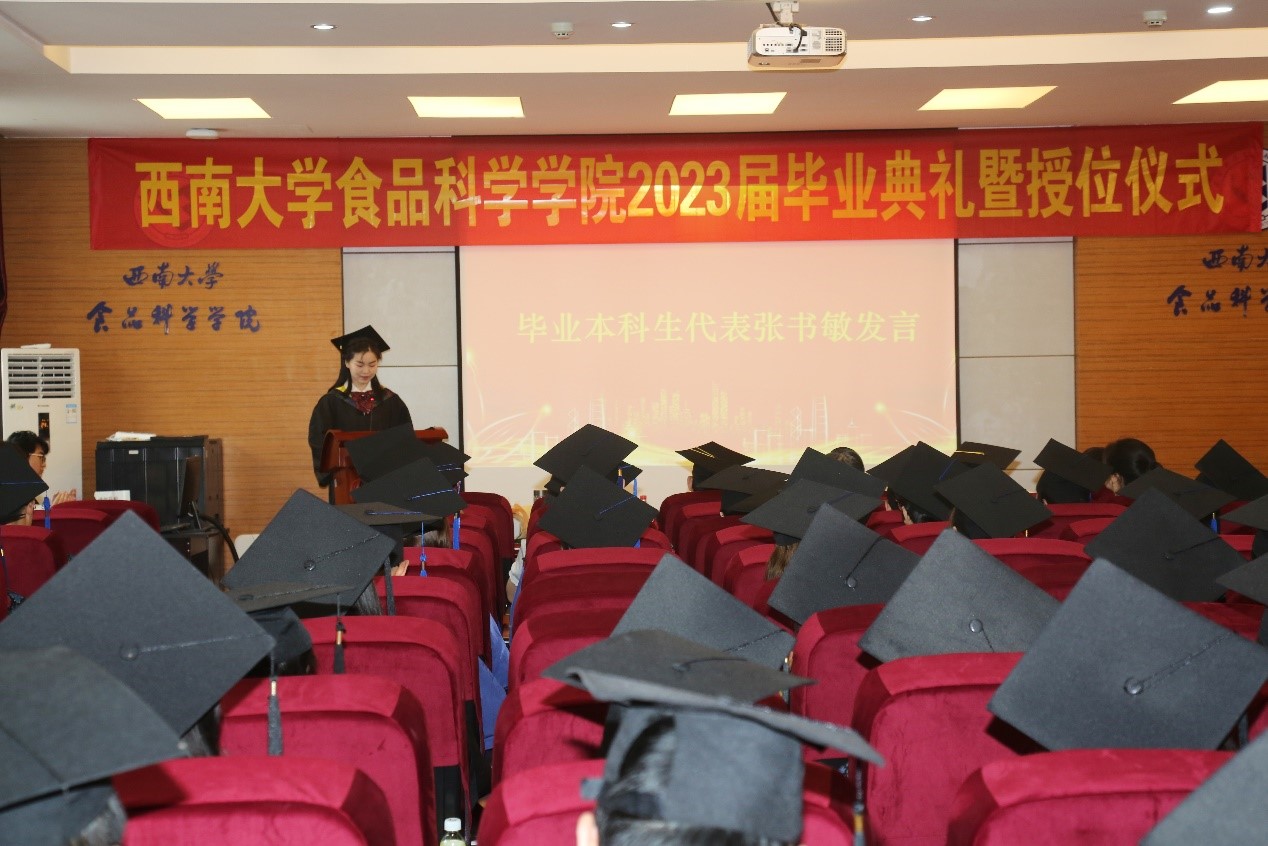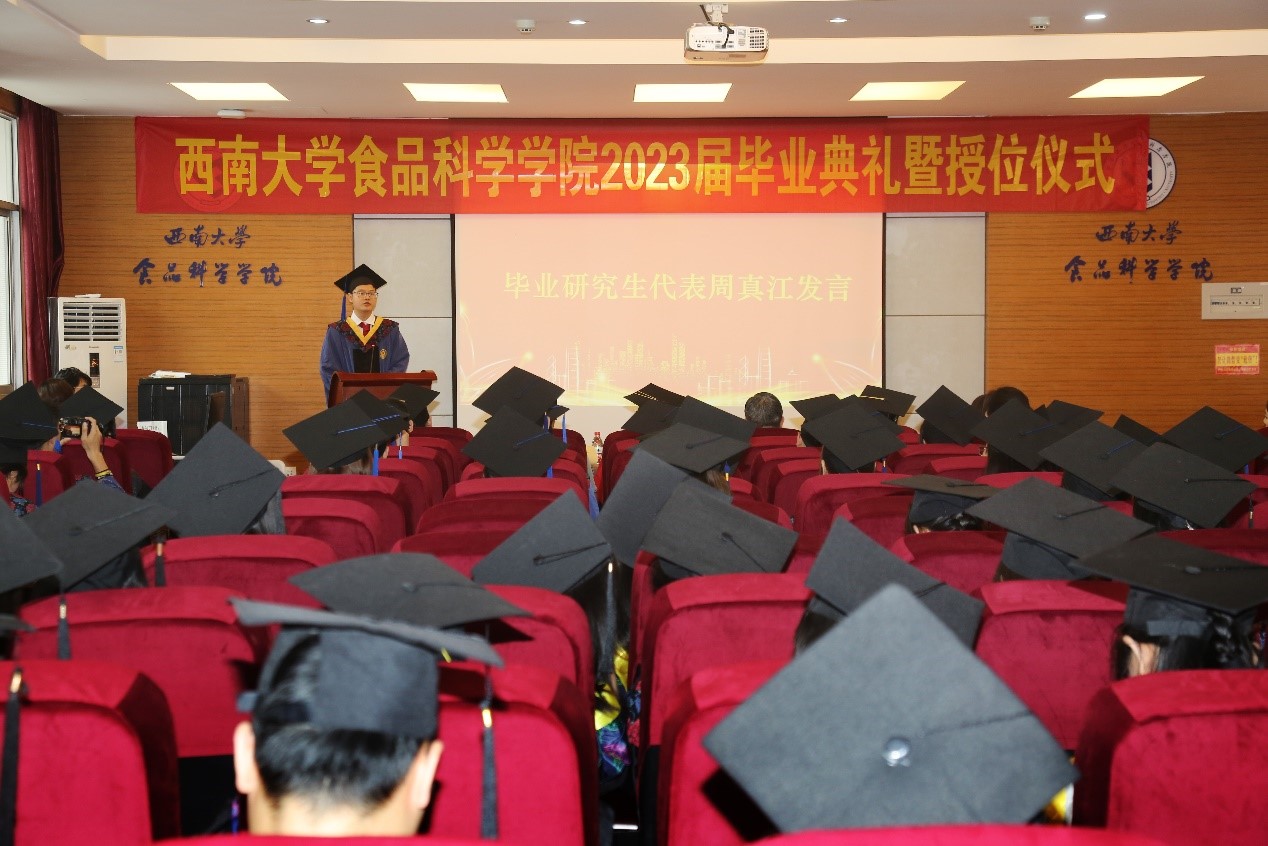 研究生代表周真江、本科生代表张书敏代表毕业生进行发言。他们回顾了自己求学路上的深刻经历和美好时光,表达了对母校、老师、亲友、同学的感谢,并号召同学们铭记“含弘光大 继往开来”的西大精神,保持食品院人特有的“明德弘食 至善尚品”的优秀品质,极力践行“有理想、敢担当、能吃苦、肯奋斗”的青春誓言。