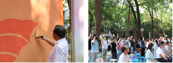 党委书记吴俊平带头在展板上题写了“发扬志愿精神,做新时代青年”的青春寄语,老师同学们也纷纷在展板上为火柴头成立十周年送上了祝福。最后由火柴头失物招领中心队长李利华带领全体同学进行宣誓。