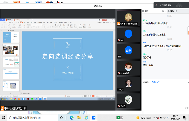 的保研政策、保研条件,特别强调了保研注意事项,为低年级同学带来了一场实用的“保研”启蒙课、答疑课;张海瑶、王一州、史文婧则将自己成功上岸、成功留学的经验毫无保留的分享给同学们,为正在备考的同学指明了复习的方向,也避免了“踩坑”;张艳、金蝶则以自己为案例,从多个维度为同学们疏导就业压力、增强求职技能;胡明丽、陈威洋、李兴洲用生动幽默的语言将自己在“考公”方面的高分经验一一传授给大家。针对以上内容,同学们在认真笔记的同时也积极思考、主动提问,与相应的分享人进行了深入的交流,线上提问同步也进行。