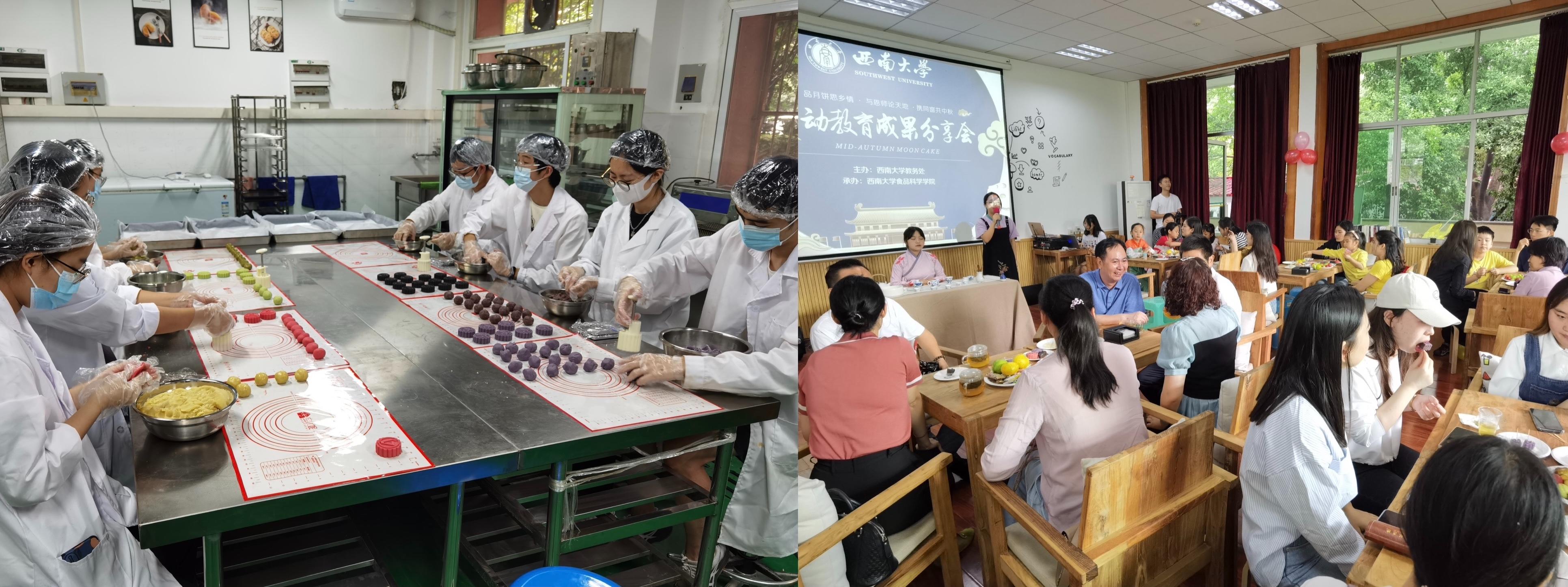 茶、葡萄酒等特色研究方向,创造性改良出青苹果茶渍青梅、紫薯薏仁紫米、经典藤椒牛肉、浓情红酒蔓越莓四种口味月饼,同时别具匠心地将校徽、院徽及其他校园记忆做成logo印在月饼上,凸显满满的西大特色。在月饼的研制过程中,俱乐部同学们不怕困难,大胆实践,敢于创新,从天然食材中提取颜色,用天然食材搭配馅料,经过揉、搓、包、烤四道流程,四款低热量、低糖分的月饼便呈现在我们面前。