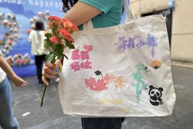 为毕业生特别设计了DIY毕业帆布包、鲜花签名墙、冷餐会、照片墙打卡四个体验环节。独具匠心的伴手礼紧扣“毕业”的主题,为晚会增添了一份仪式感。