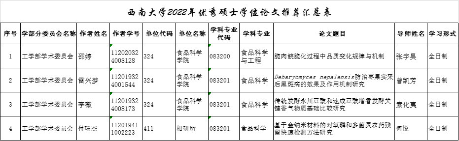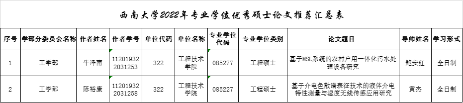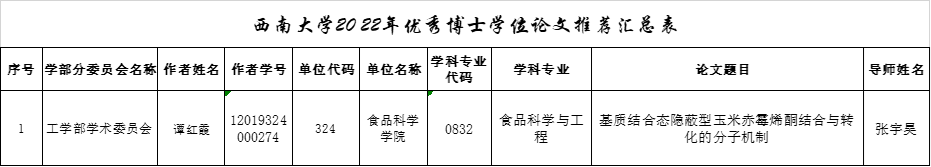 根据《关于做好2022届研究生毕业暨学位授予工作的通知》及《西南大学研究生优秀学位论文评选管理办法》(西校〔2021〕251号)等相关文件要求,经本人申请、博牛社区 审核、学部学术委员会评审推荐,现将结果公示如下(排名不分前后):