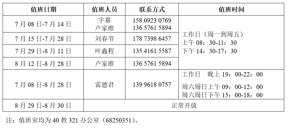 为保障暑假期间师生有序开展实验活动,博牛社区 仪器设备共享服务平台及教学实验室正常开放。值班安排如下: